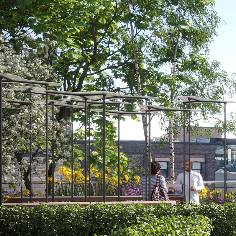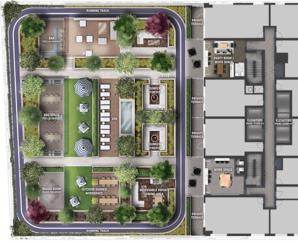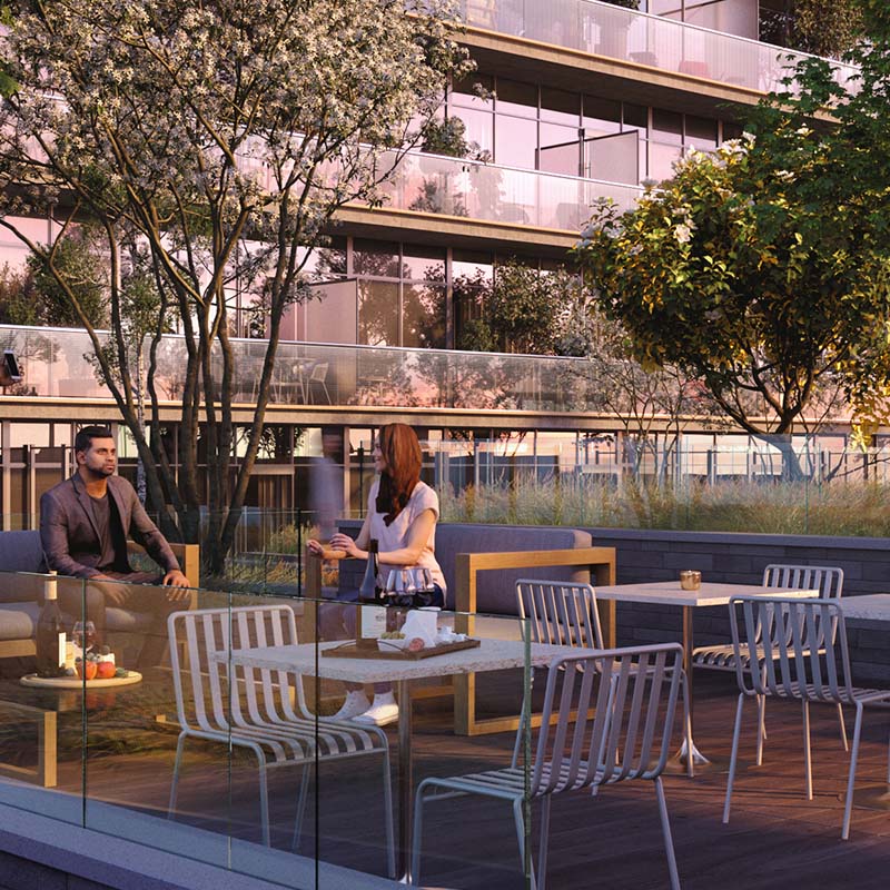 With lush landscaping and large mature trees for shade, the terrace is designed to give you a connection to nature in the city.
