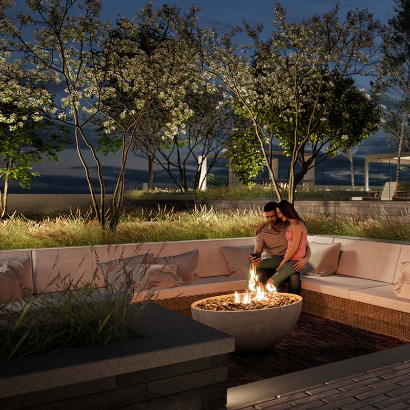 Cozy up with your partner or have an evening chat with friends; the roof-top park features lounge areas and private fire pits.